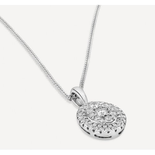This 9ct white gold pendant showcases a 0.25ct diamond cluster in an elegant oval design. Perfect for any occasion, it adds a touch of sparkle and sophistication to your look.