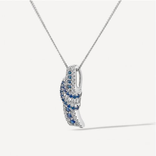 Crafted in 9ct white gold, this wave pendant features a sapphire center highlighted by 0.13ct of diamond baguettes. A unique piece that combines elegance with a modern twist.
