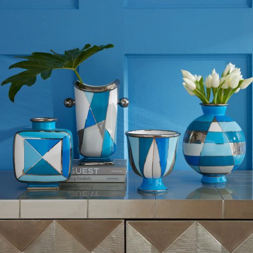 Our Torino vessels are wrapped in our favorite brilliant blue hues and accented with shiny silver accents—bella, bella! Featuring classic shapes and cool, crisp color, each porcelain piece is a modernist must-have. Fab flanking a fireplace, chic standouts in your tablescape, and as refreshing as a seaside breeze in Capri when the collection is styled together.